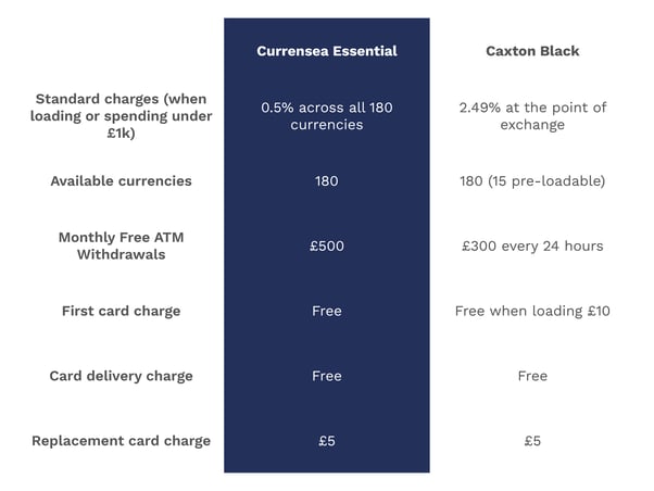For this comparison, we’ll focus on Currensea Essential, which is free, just like the Caxton Black card.