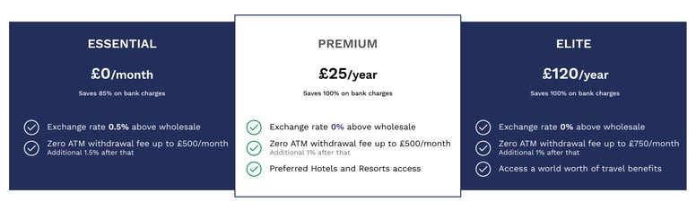 - Essential: £200/month fee-free, then 2% FX fee