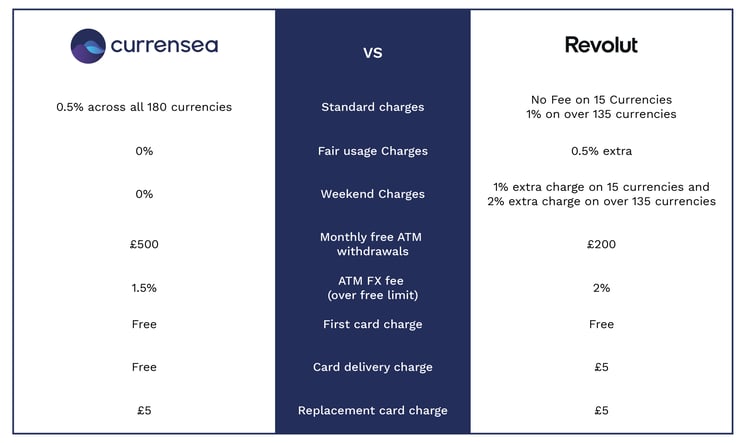 2️⃣ You don’t need cash. While Currensea’s worst-case ATM fee is 2% beyond £500, Revolut charges that rate after just £200 (or 5 withdrawals per month).