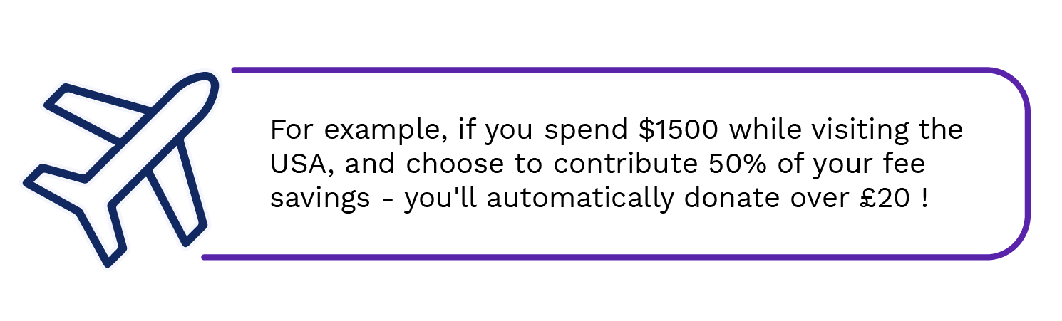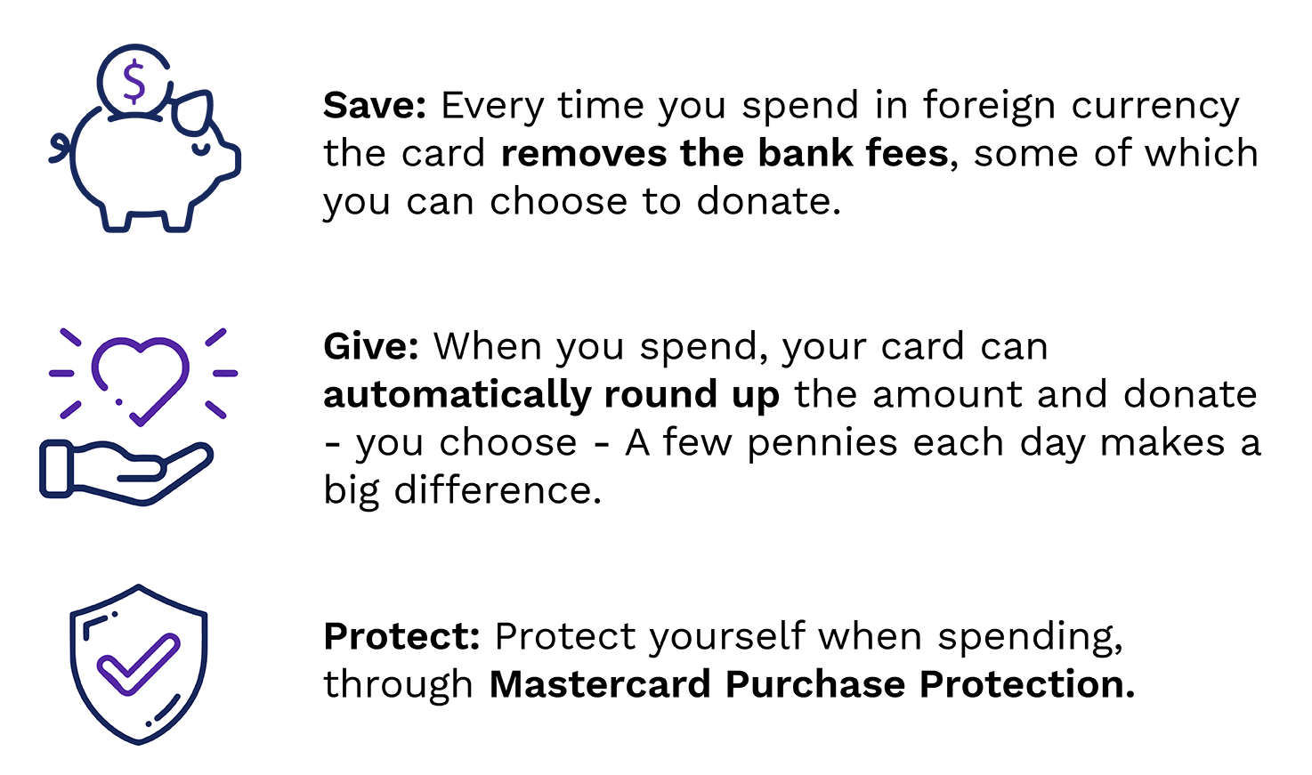 Whenever you spend in foreign currency (online shopping or travelling abroad), your bank typically charges 3-5% in fees. Your new debit card removes the bank fees. Some or all of those savings can automatically be donated. You decide how much.